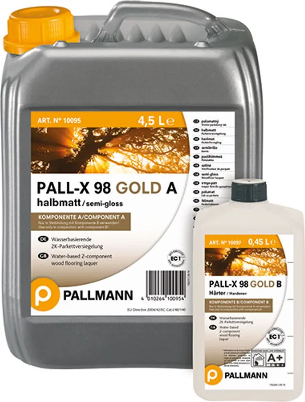 Pallmann Pall-X 98 Gold A/B Satin 4,95 L är en premium 2-komponents golvlack med sidenmatt glans. Den satinliknande ytan ger ett exklusivt, mjukt skimmer som lyfter träet utan att bli för blank.