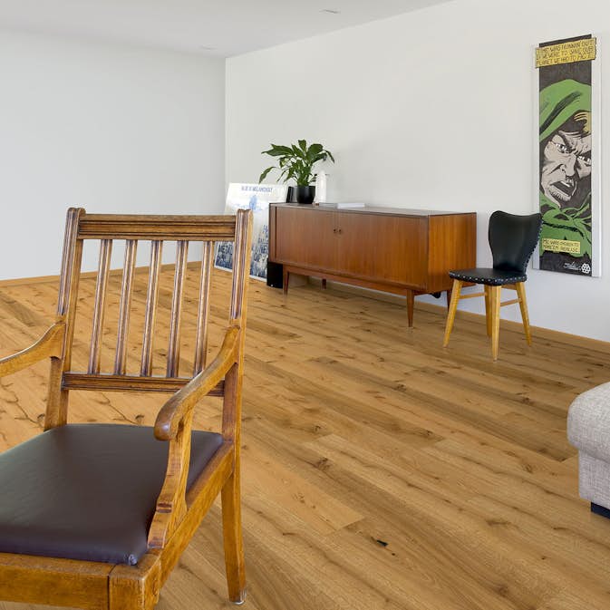 Ek Raskamåla XXL 1-stav Ek med kärnved, stor fas och med svart träspackel ger en färgrik struktur med alla färgvariationer, kvistar och splint, borstad och naturoljad yta.