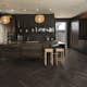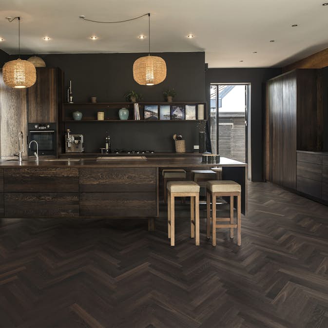 Studio Rökt Ek AB är ett mörkbrunt parkettgolv med en oljad ytbehandling från Kährs som läggs i fiskbensmönster. Detta oljade ekgolv har en viss färgvariation med förekommande små kvistar.