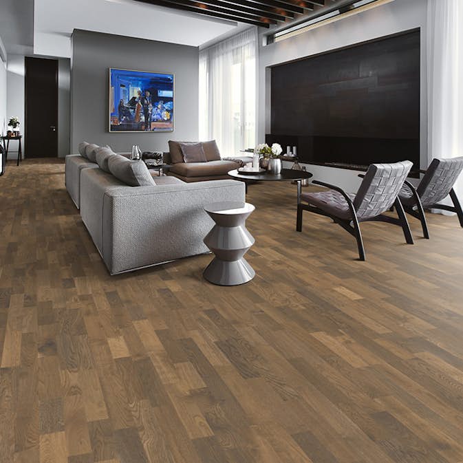 Ek Dusk är en 3-stav i mättade jordfärger och med en rökig finish som accentuerar de naturligt förekommande variationerna i träet. För ett tidlöst och klassiskt uttryck är varje bräda noggrant borstad vilket lyfter fram de mörkare nyanserna i träets ådring. Den ultramatta ytan minimerar ljusets reflektioner och låter färg och känsla hos golvet komma till sin fulla rätt samtidigt som träet skyddas från dagligt slitage.