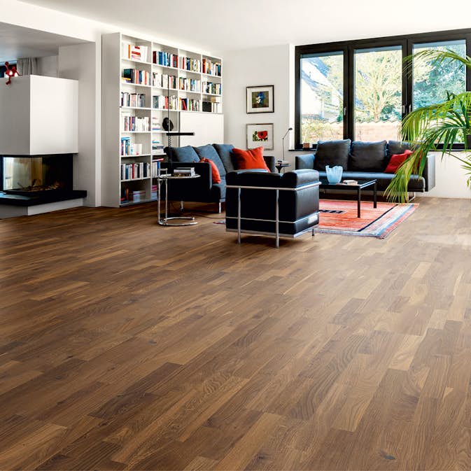Trägolv i ek med en borstad och rökt yta. Tre skikt av massivt trä. Golvet har Berg & Bergs egna klicksystem Svedloc Plus. Denna fog låser samman brädorna och när de väl är låsta förblir de sammansatta. Vid flytande installation rekommenderas det att använda lim i noten vilket gör förbindningen extremt stark. Trappnosar finns som tillval. Golvet är FSC®-certifierat (C030473) och tillverkat med råvaror från ansvarsfullt skogsbruk. Detta oljade golv är NaturePlus®-certifierat (0209-0311-018-1), vilket är ett kvitto på ren och effektiv produktion, omtanke för miljö och hälsa samt användandet av enbart förnybara insatsvaror.