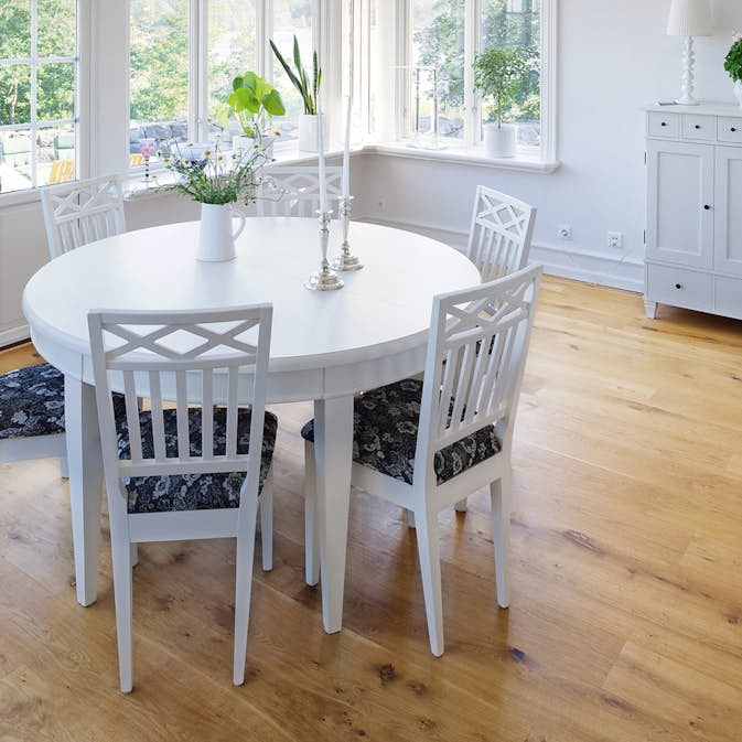 kvistar, färgskiftningar och ådring – får stå i centrum. Den borstade, naturoljade ytan ger en