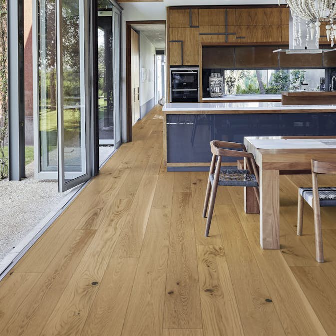 Ett vackert och modernt 1-stavsgolv i Kährs Lux-kollektion som är pigmenterat med en naturlig och varm ljusbrun ton. Den fyrsidiga mikrofasen runt varje bräda lyfter fram det exklusiva plankformatet. Varje bräda har borstats noggrant för att locka fram nyanserna i träet. Den ultramatta ytan minimerar ljusets reflektioner och låter färg och känsla hos golvet komma till sin fulla rätt samtidigt som träet skyddas från dagligt slitage