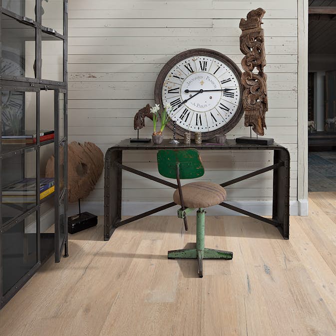 Trägolv Kährs Ek Gustaf är ett infärgat svagt vitt golv som är oljat med en genuint rustik karaktär. Golvet är kraftigt borstat och har handskrapade plankor med fasade kanter. Den handarbetade ytan ger brädan en unik träkänsla samt de stora, delvis spacklade kvistarna och sprickor ger en tydlig patina.