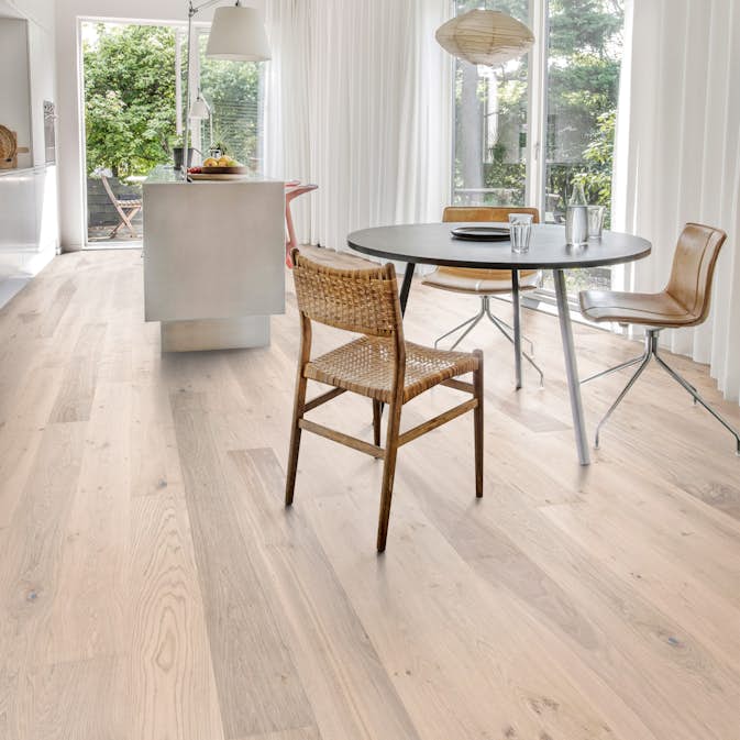 Kährs Sky Vit Ek är ett borstat 1-stavsgolv i en semitransparent vit nyans som balanserar