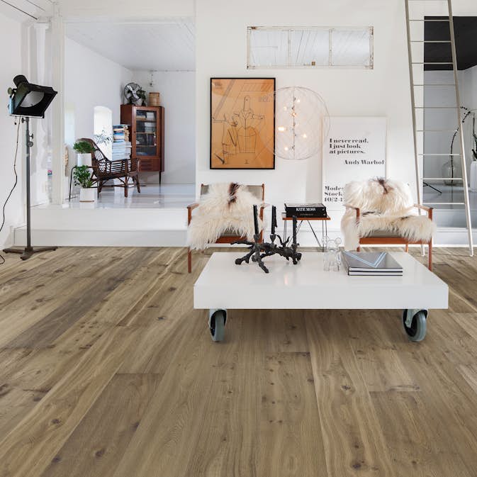 Kährs Ydre Ek är ett karaktärsstarkt 1-stavsgolv i ek med rökt gråbrun ton och naturoljad yta.