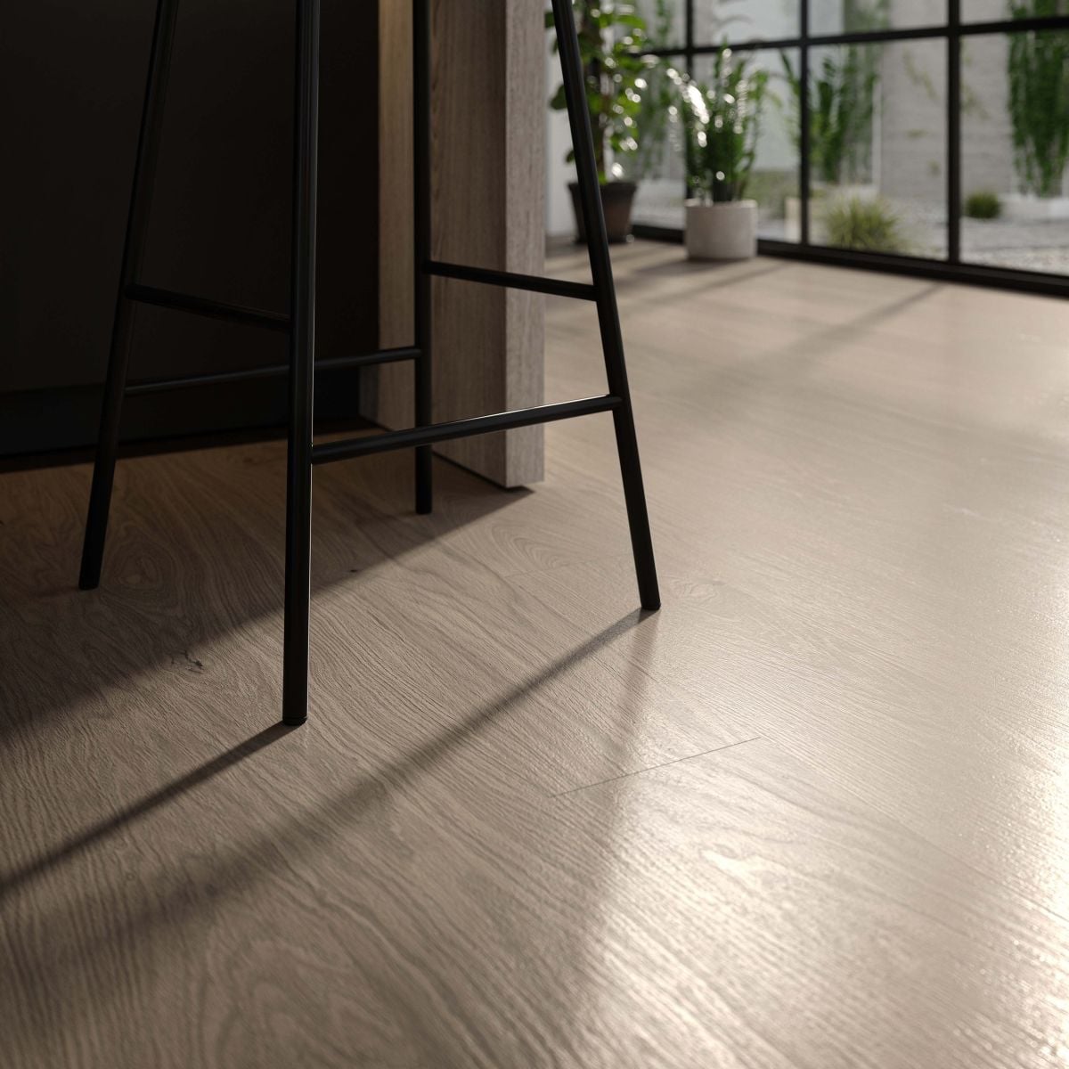 Färgen är mjuk och nedtonad, vilket gör golvet väldigt lätt att kombinera med både ljusa och