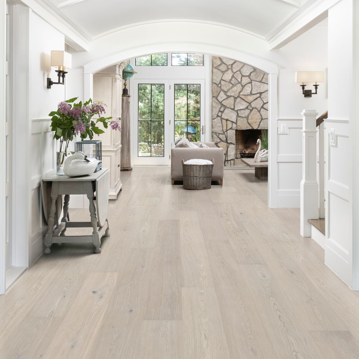 stora plankor i samma stilrena Powder White-nyans. Golvet skapar en ljus, sammanhängande