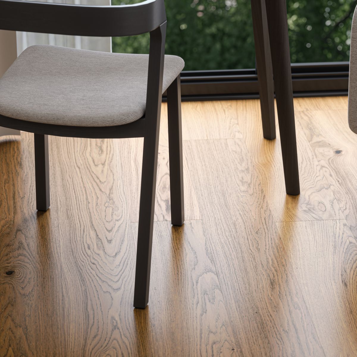 • Mattlackat härdat trägolv med kontrasterande natur- och gråtoner