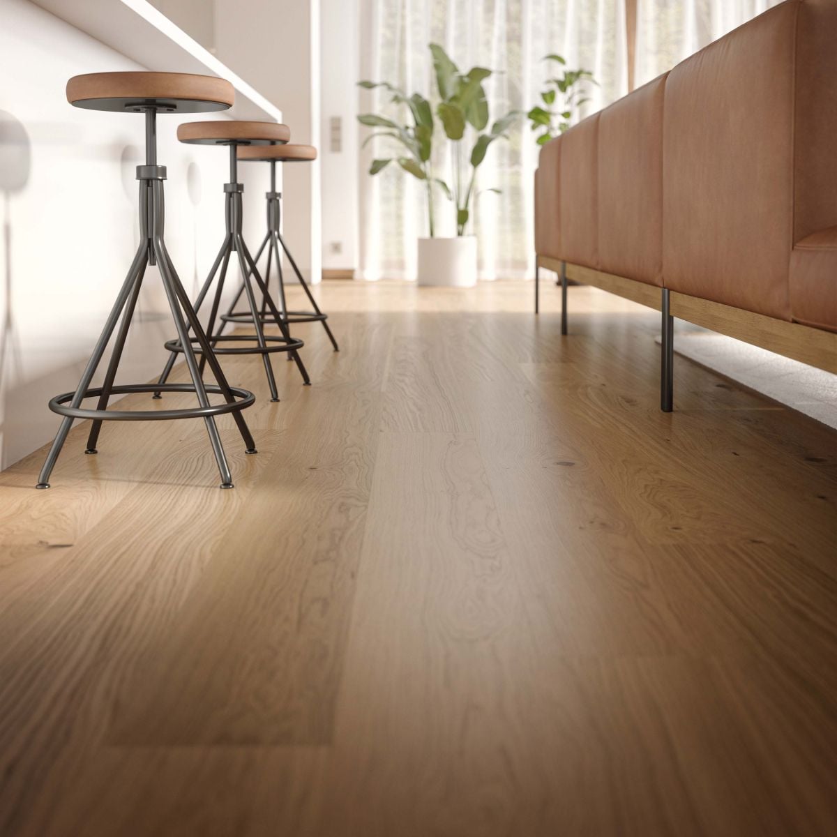 Den borstade ytan framhäver ådring, porer och struktur i eken, vilket ger ett golv man både ser och