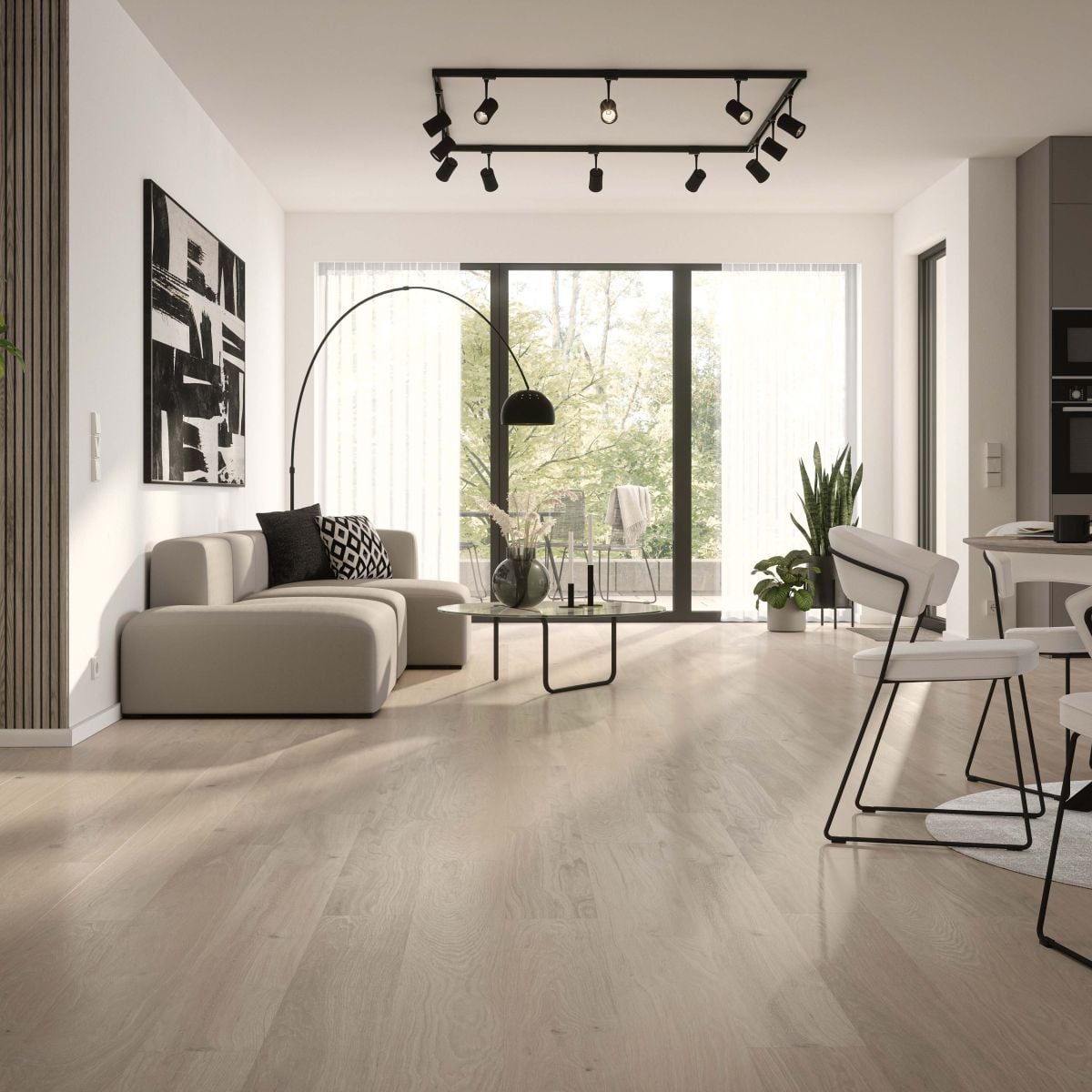 Woodura Planks VIARP 3.0 L är ett modernt härdat trägolv i den ljusa och fräscha nyansen
