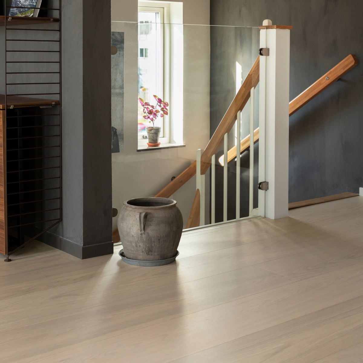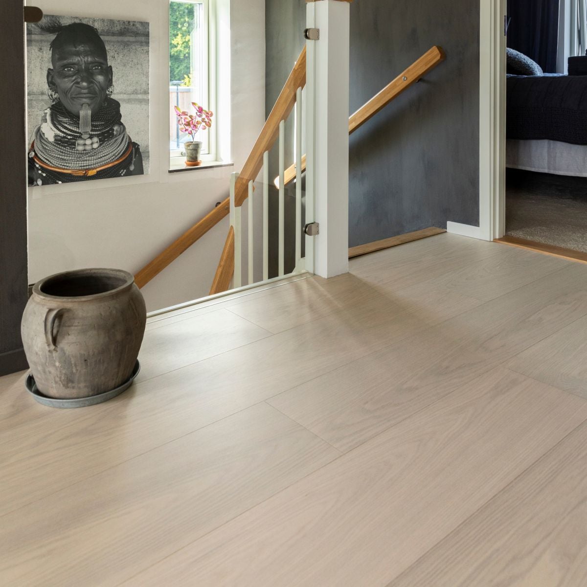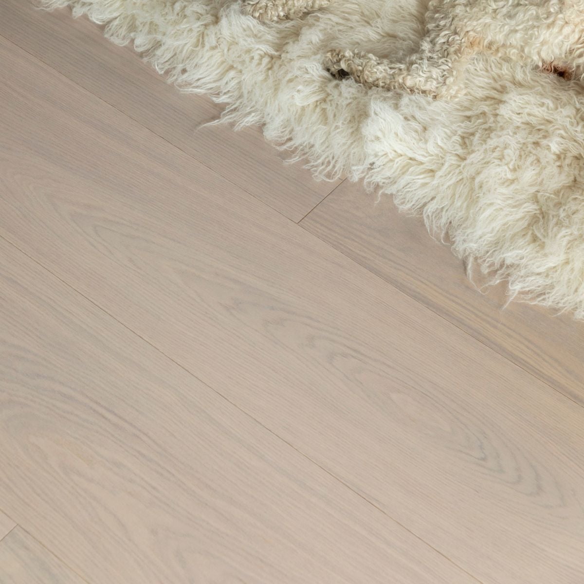 Woodura Planks VISTORP 3.0 XXL är ett ljust, pudervitt mattlackat härdat trägolv i extra